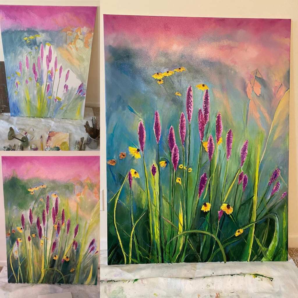 The second painting I did was larger and intended for our master bedroom. In fact, this is the largest painting I have created, except for a set design for a theatrical performance in Virginia. My husband requested a floral painting. I decided with the scale of the wall, a simple landscape or still life would not do. I wanted to create a scene that made you feel insignificant and like you were within the field of wildflowers.